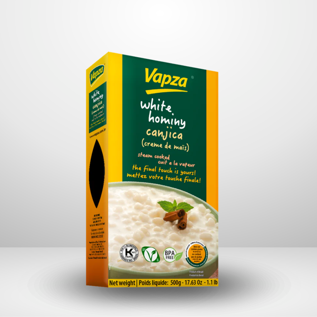 Vapza White Hominy is a traditional Brazilian ingredient made from dried, hominy corn, often used in Brazilian and Latin American cuisine. Ready to use, this product is perfect for making delicious stews, soups, or desserts like canjica, a creamy and comforting dish made with hominy and coconut milk.